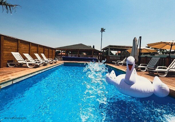 בחצר המתחם עומדת לרשותכם בריכת שחייה גדולה, מגודרת ונעולה, ג'קוזי ספא, משחקי חצר, מרחבי דשא גדולים וירוקים להנאת האורחים עם פינות ישיבה, עמדת ברביקיו ועוד.