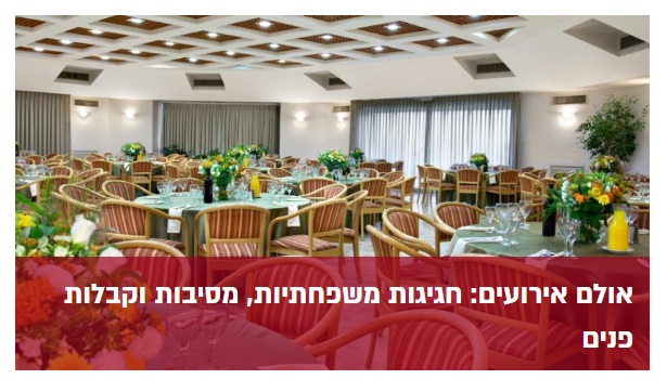אצלנו בבית מאירסדורף, בית הארחה ומרכז אירועים בירושלים, תוכלו ליהנות מאולם אירועים מקורה וחלל אירוח תחת כיפת השמיים ומול הנוף הקסום ועוצר הנשימה של ירושלים. מרכז האירועים שלנו מותאם לכל סוגי האירועים עד 300 איש, מחגיגות משפחתיות ואירועים עסקיים, דרך מסיבות קונספט לעובדי חברות ועד לקבלות פנים רשמיות. בנוסף ללוקיישן המיוחד והמרגש שלנו, תוכלו ליהנות מפתרונות קצה לכל מה שצריך לאירוע המושלם והכול בליווי מקצועי של צוות מיומן שילווה גם אתכם ברגעים הבלתי נשכחים והמשמחים של החיים.