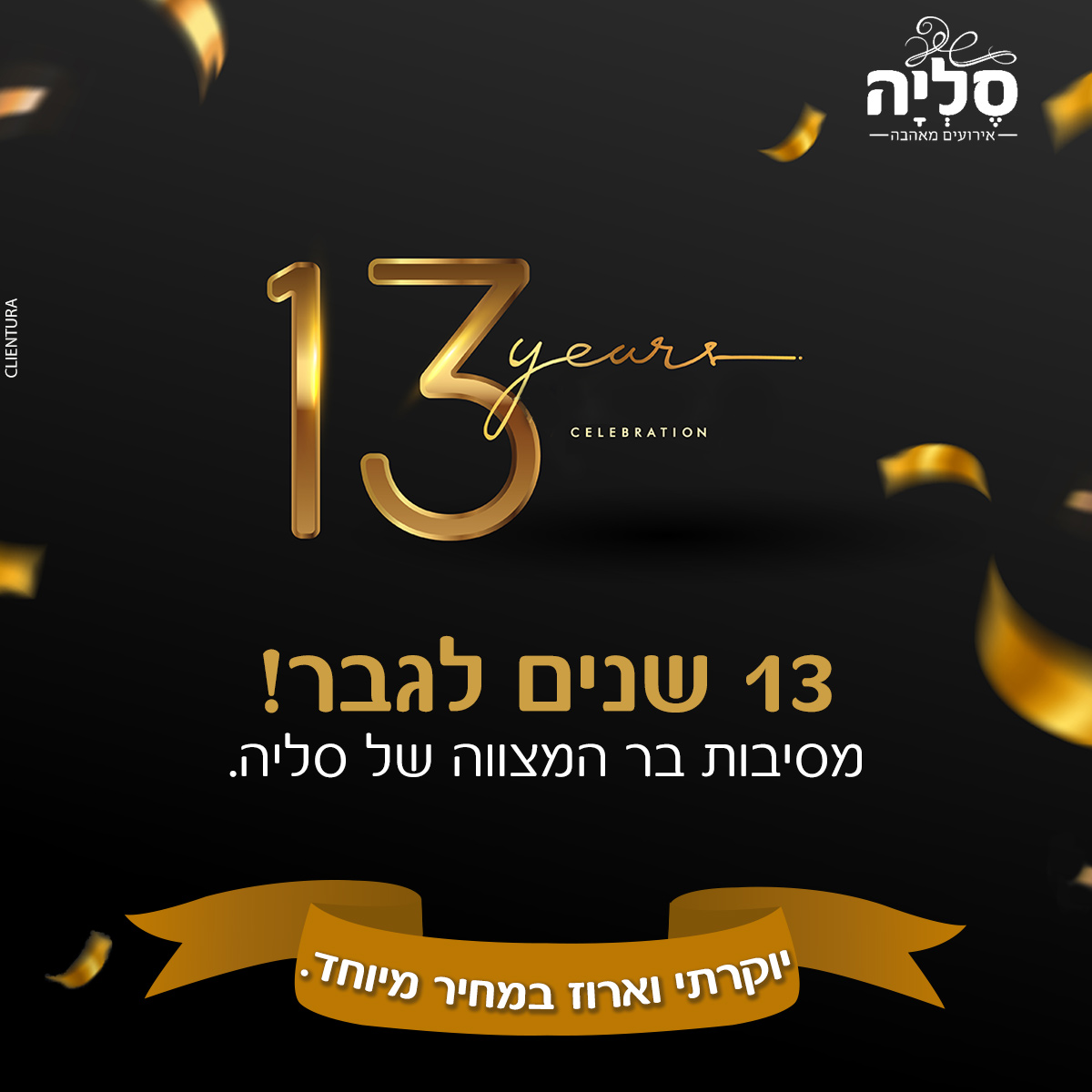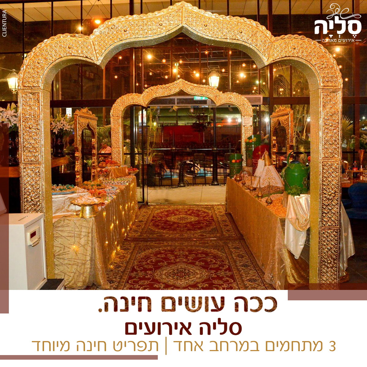 אצלנו במתחם האירועים סליה, ממתין לכם מרחב אירוח מודרני ומעוצב המשלב בתוכו 3 אולמות אירוח בגדלים שונים לאירועי חתונה קטנה עד 80, 300 ו-350 משתתפים. בכל אחד מהאולמות שלנו, תוכלו למצוא מערכות אירוח מפנקות בעיצוב אלגנטי, מערכות הגברה ותאורה חדישות ופתרונות קצה לאירוע המושלם עליו אתם חולמים. בין היתר, תוכלו ליהנות מתפריט שף עשיר, מגוון וכשר בהשראת המטבח הישראלי - ים תיכוני, זאת לצד שירותיו של צוות ניהול מקצועי המלווה אתכם לאורך כל הדרך. אתם מוזמנים ליצור איתנו קשר, לשתף אותנו באופי האירוע עליו אתם חולמים וביחד נגשים את החלום!