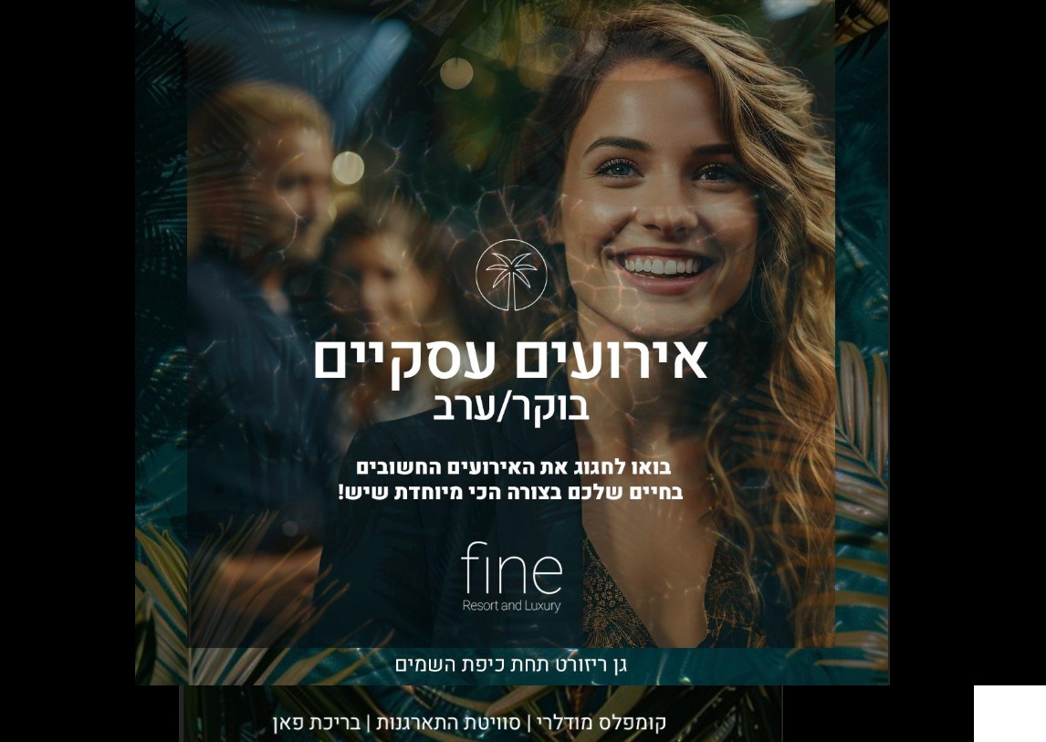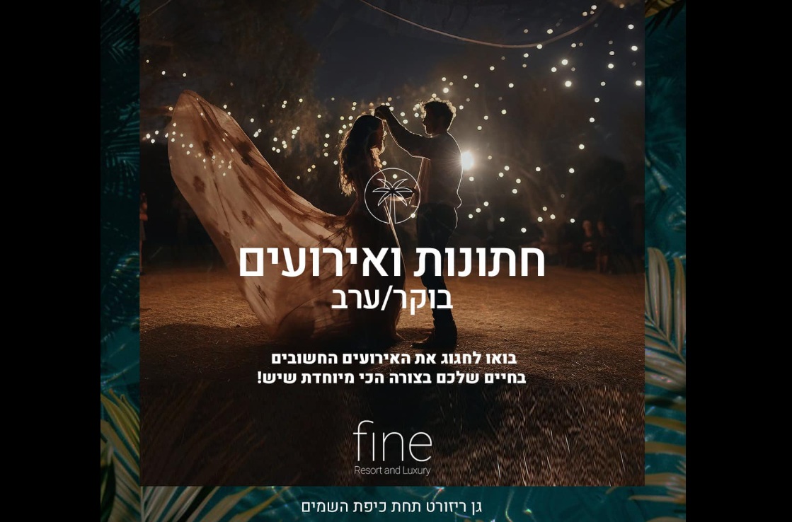 מחפשים את המקום הכי מיוחד לאירועים בחיפה והקריות? זה הזמן להכיר את FINE events, מתחם בוטיק חדש הממוקם בתוך ריזורט גן קסום בלב חיפה והקריות. במקום, תוכלו לקיים את כל סוגי האירועים, הפרטיים והעסקיים, לקהל של עד 250 משתתפים ולהבטיח לעצמכם חוויית אירוח מפנקת במיוחד שכל האורחים לא יפסיקו לדבר עליה.